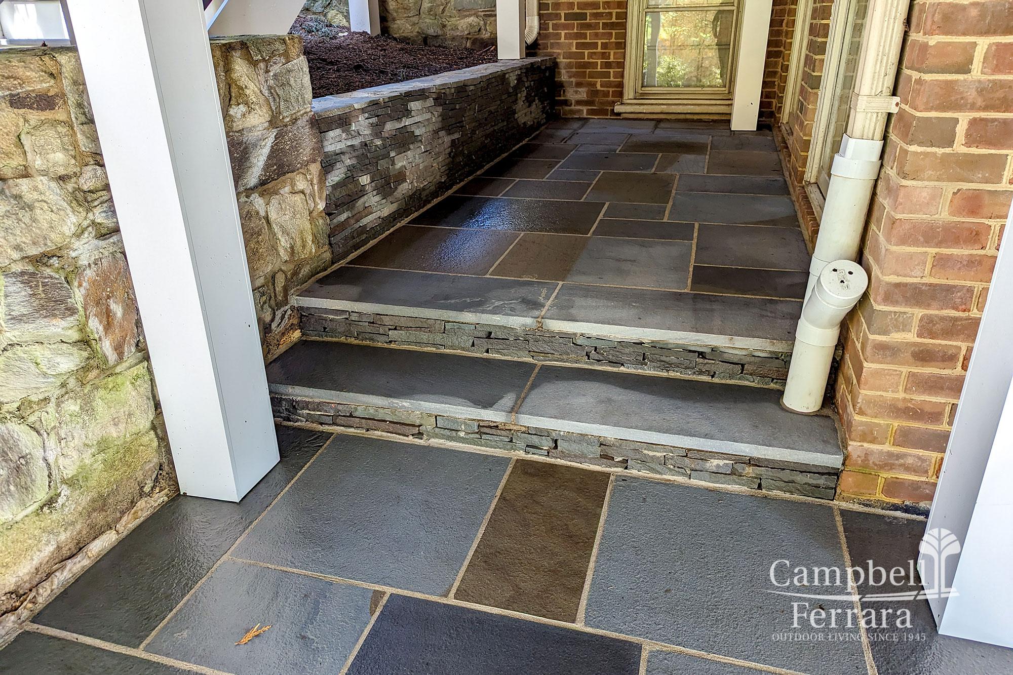 The existing wood deck was replaced with a composite deck. The new deck is accented with aluminum balusters, creating a more contemporary look. The area underneath the deck was also renovated; the old brick patio and walkways were replaced with flagstone, leaving a more usable space. At the base of the deck’s staircase, the overgrown shrubbery was removed, and a seating wall was built to complement the existing stone walls. This aesthetic feature provides extra seating, serves as a border separating the patio area, and is a deterrent to encroaching vegetation. The landscape lighting was also upgraded, improving safety and increasing the client’s ability to enjoy their landscape into the evening.