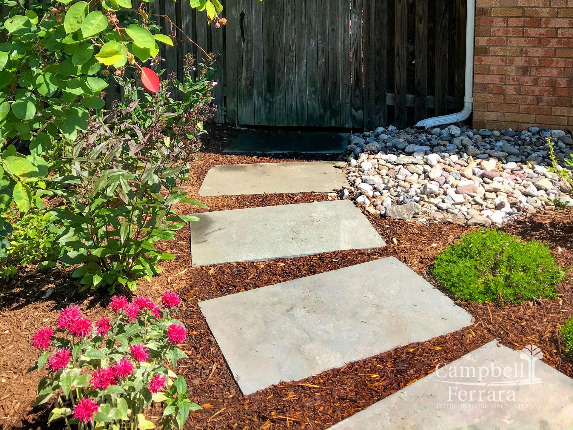 Drainage was a concern, even though the property was fairly level. Belgian block standing upright along the perimeter window wells was installed to allow the soil and river jack stone to have more of a slope away from the house. Another concern was fitting the client’s wish list into their budget. This was addressed by offering lower cost hardscaping alternatives, such as pea gravel and flagstone steppers instead of more expensive geo-cut patio and walkway options. The result was a much more organic feeling landscape that worked into their desire for an interactive landscape that benefitted both adults and children.