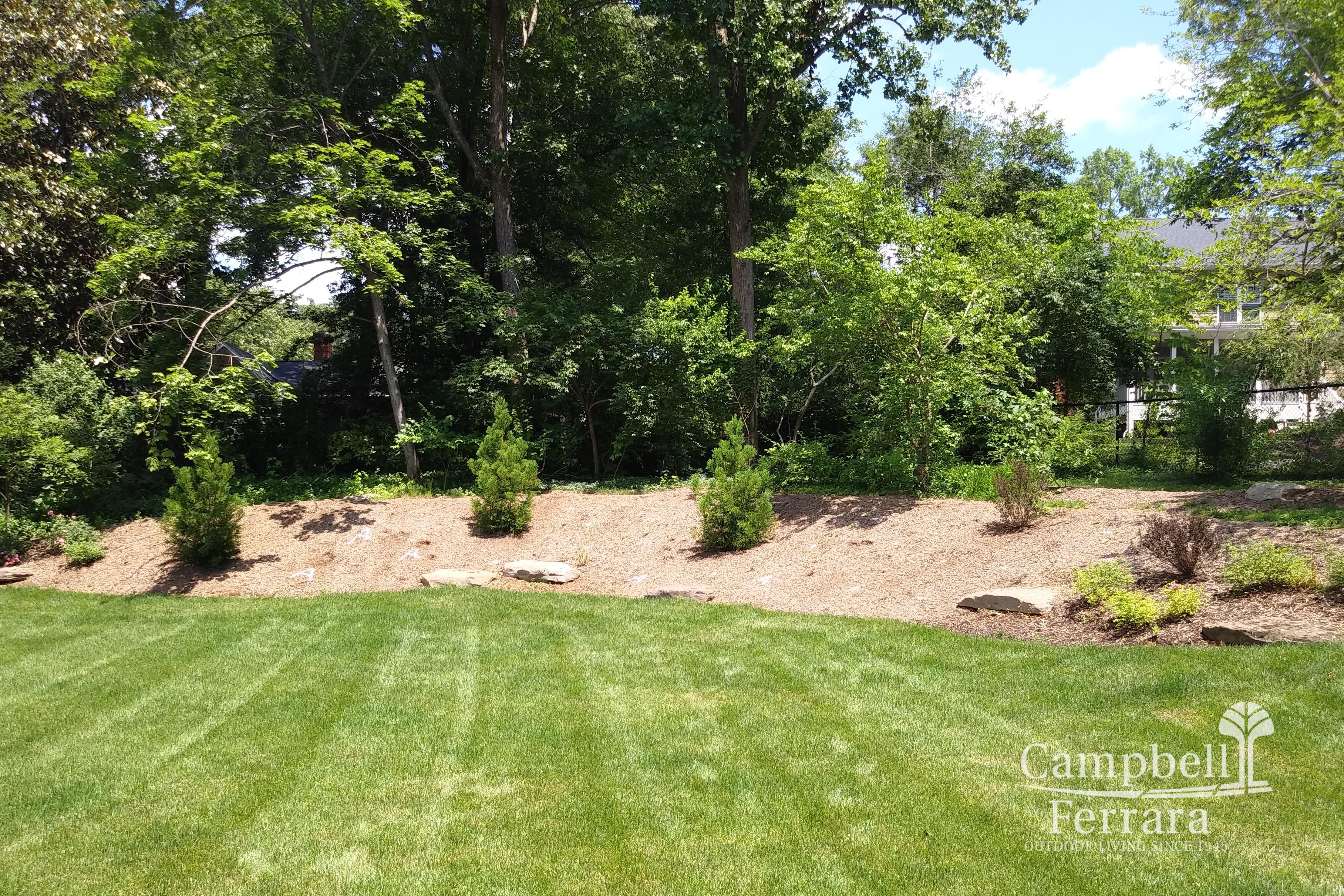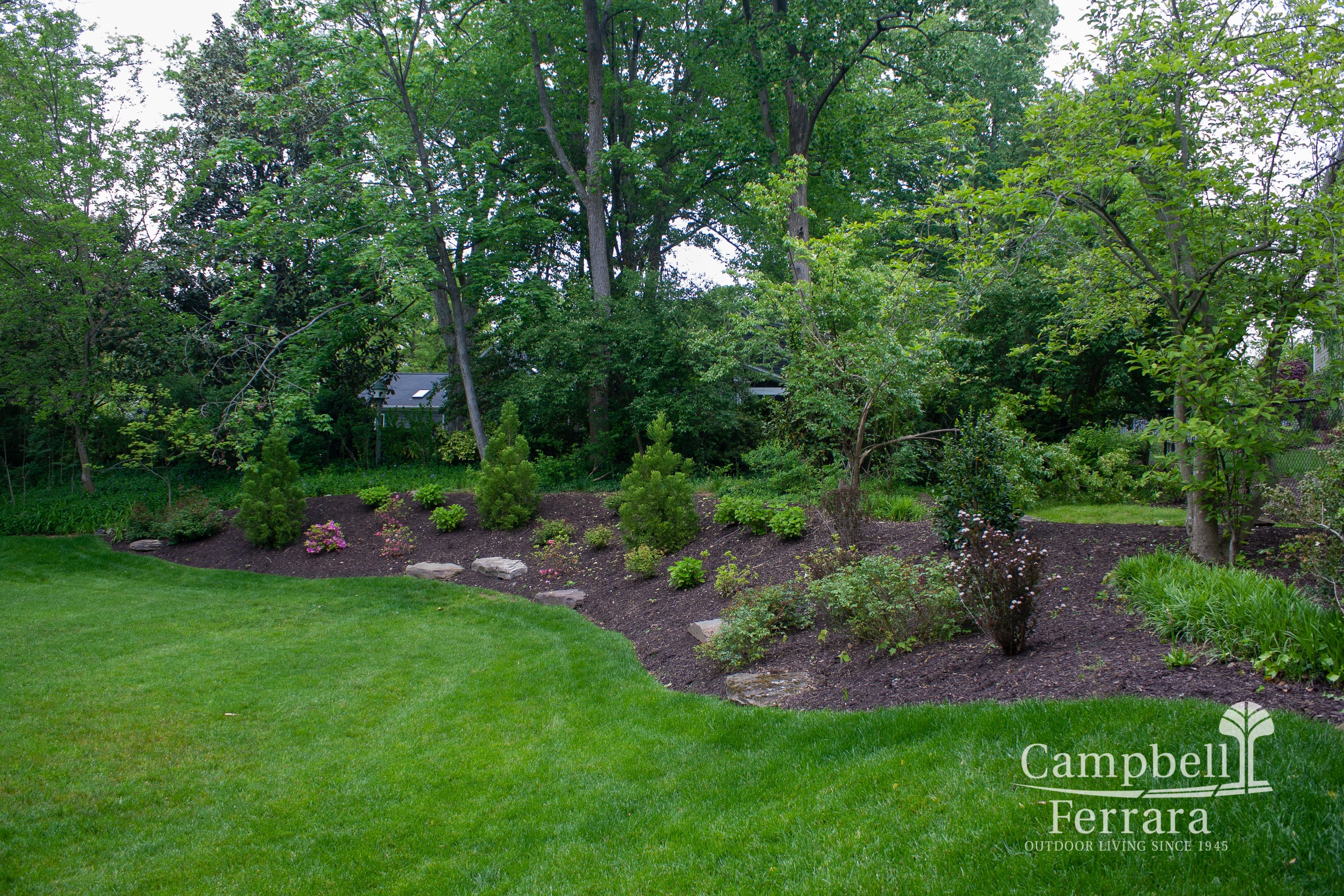 A master plan was created for the property that addressed all of the client’s objectives: a solution for their extensive drainage issues; a dry yard for their children to run and play; a low maintenance landscape with beautiful curb appeal; privacy for the rear of the property; and front and backyard lawn and plantings. For nighttime usage and safety, lighting was installed.