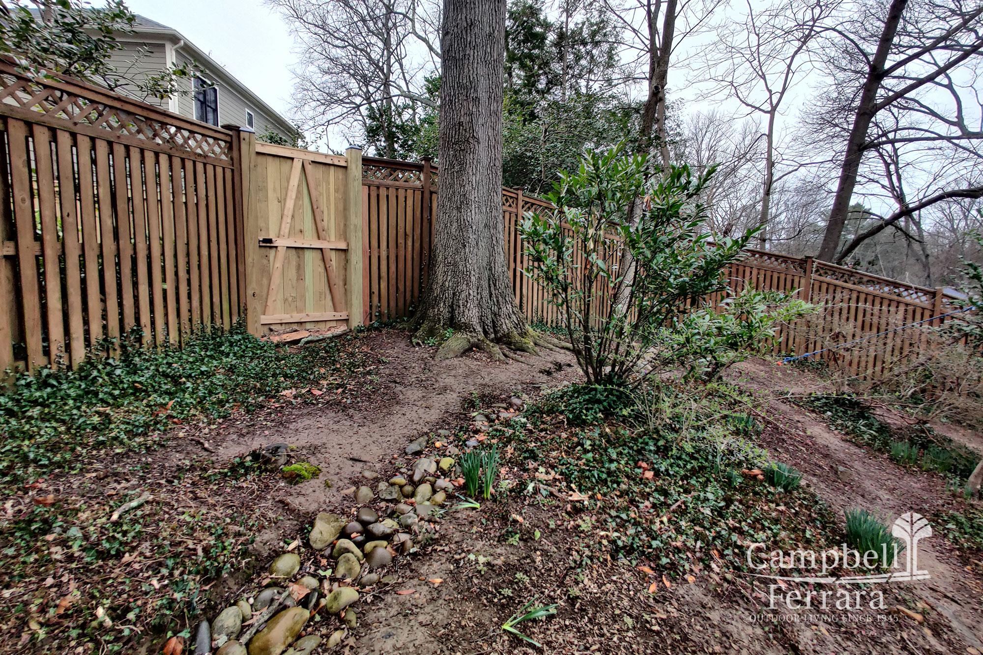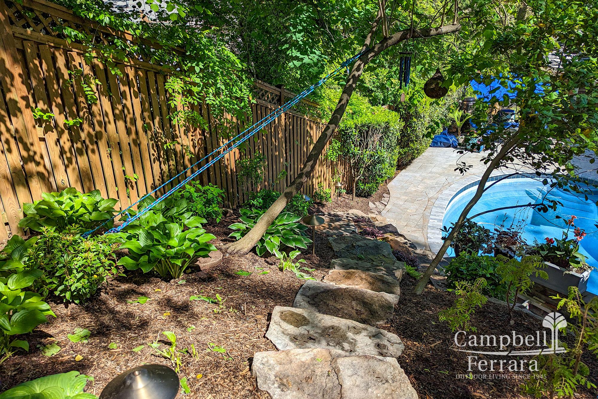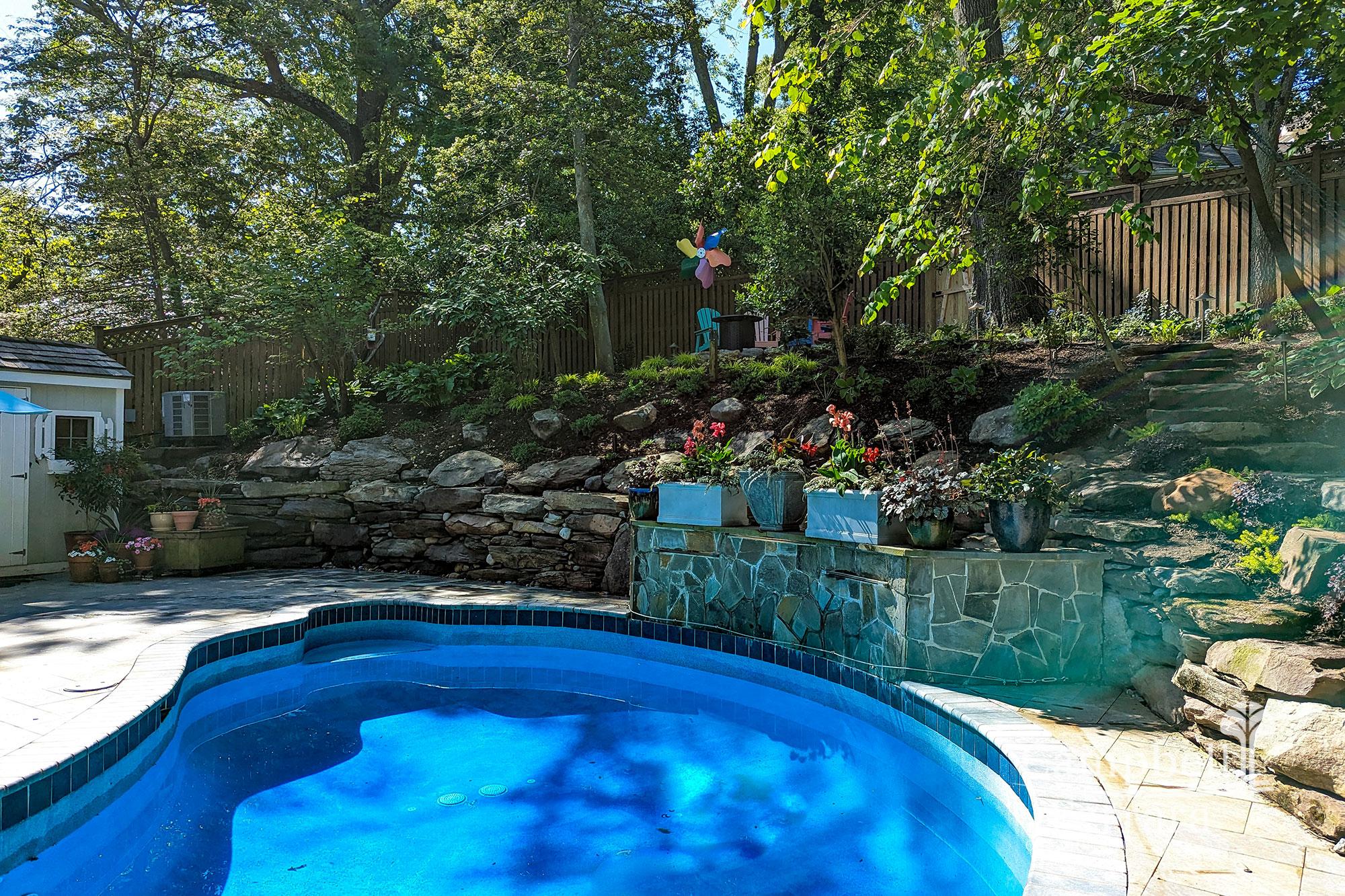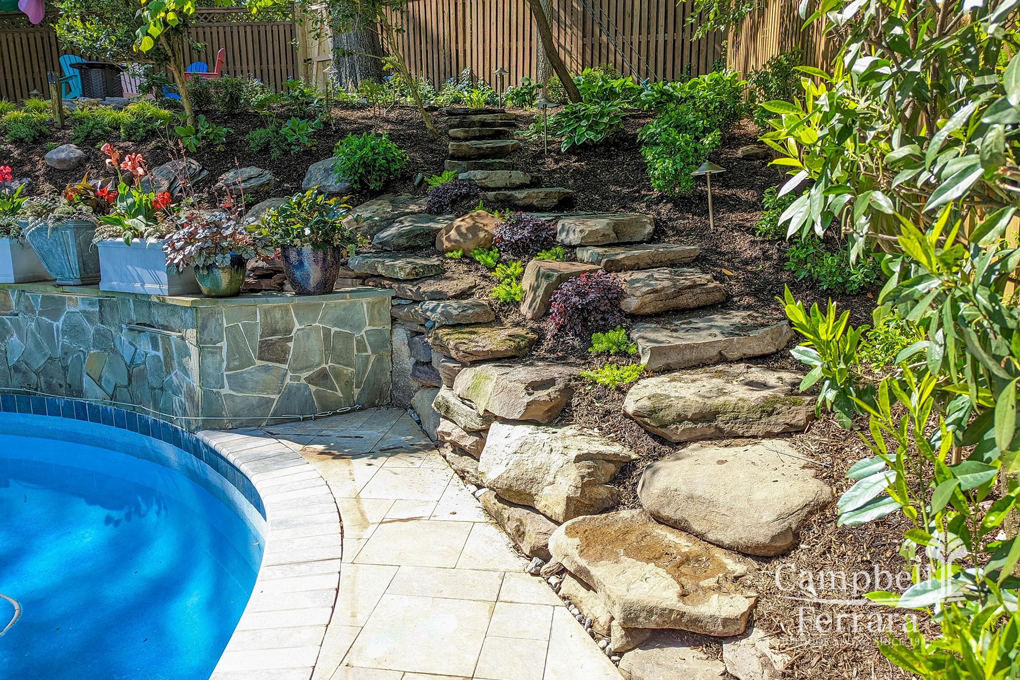 Replacement of the timber wall – The design solution for the wall was practical as well as naturalistic, using boulders and stone to create a rustic aesthetic that match the lush new plantings. This solution was more economical than a typical segmental wall and utilized assorted Fieldstone Boulders stacked on each other to evoke a rock outcropping.