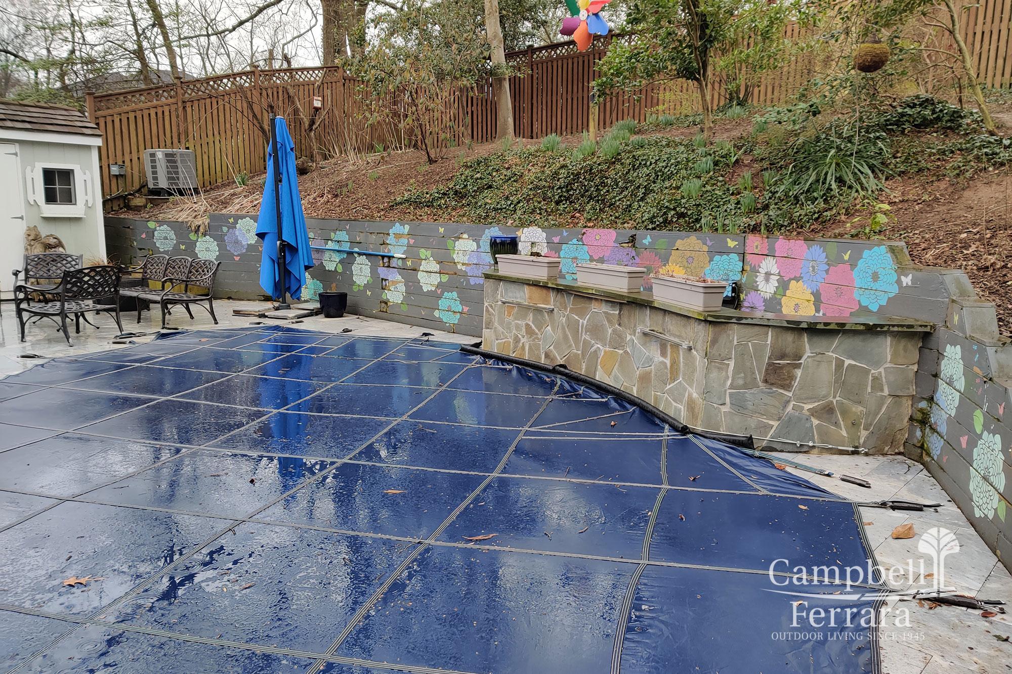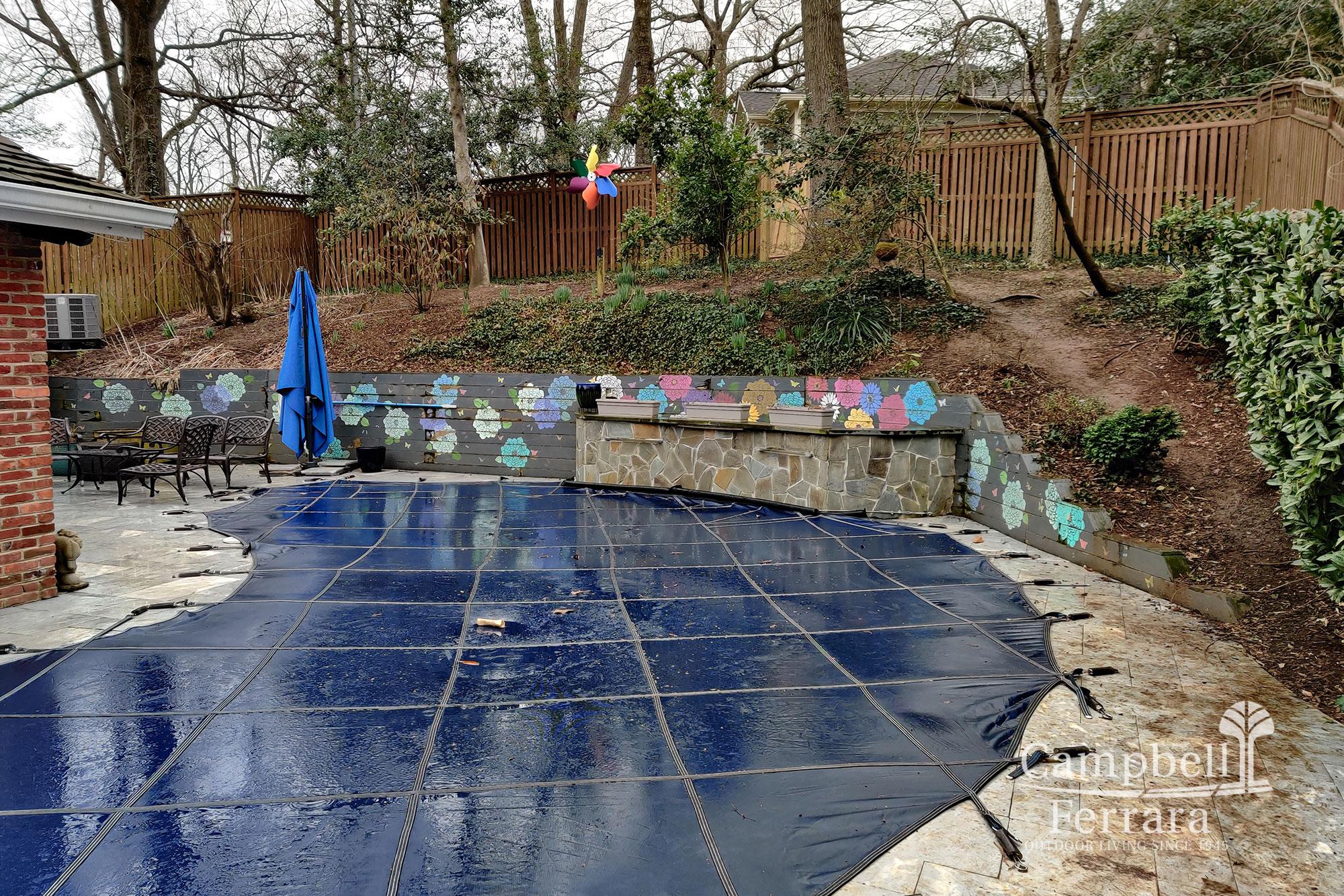 The main challenge during the installation phase of this landscape was the continuous effort to protect and maintain the integrity of the travertine decking around the pool which required shuffling plywood and landscape fabric during use of heavy machinery.