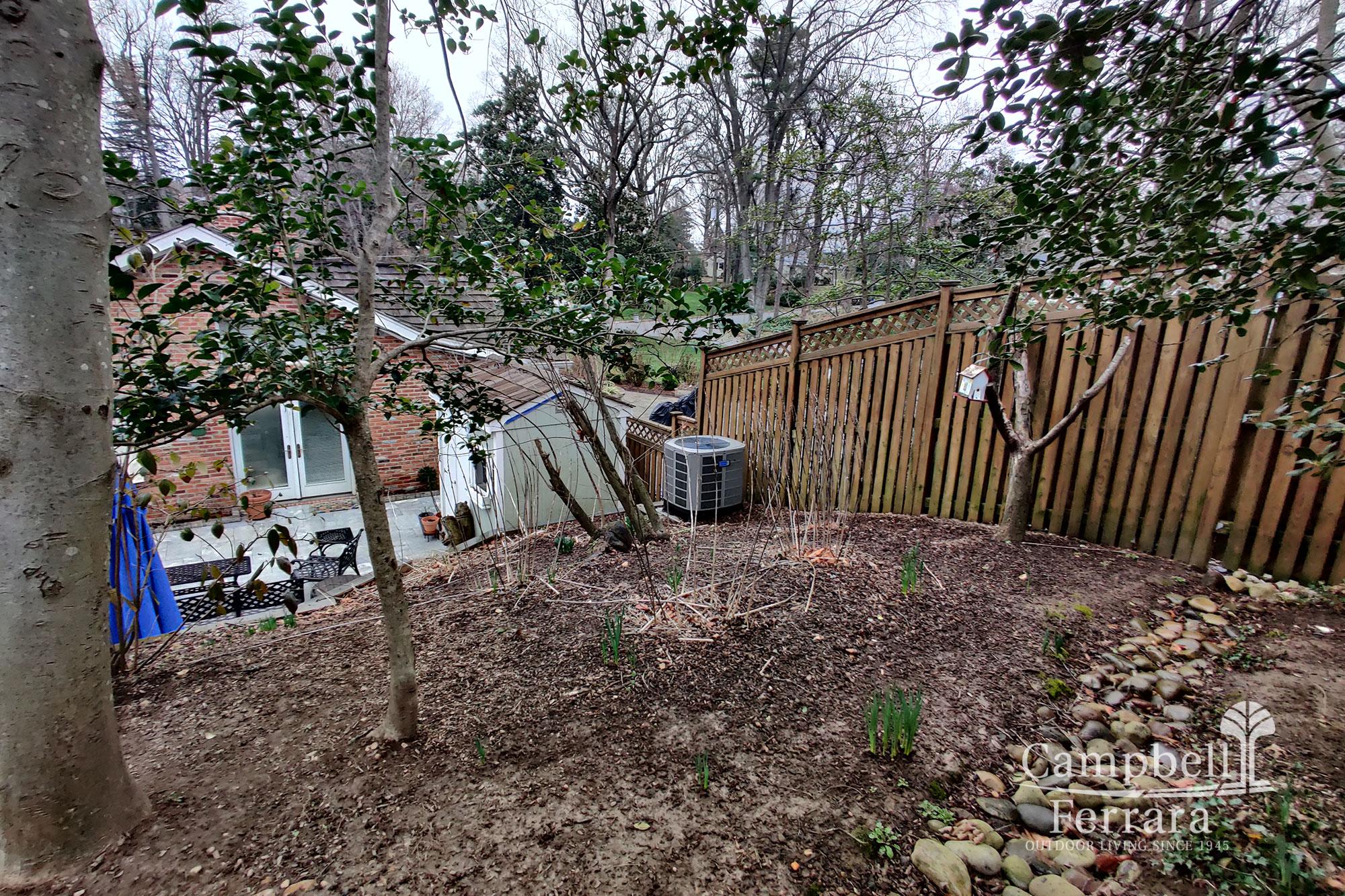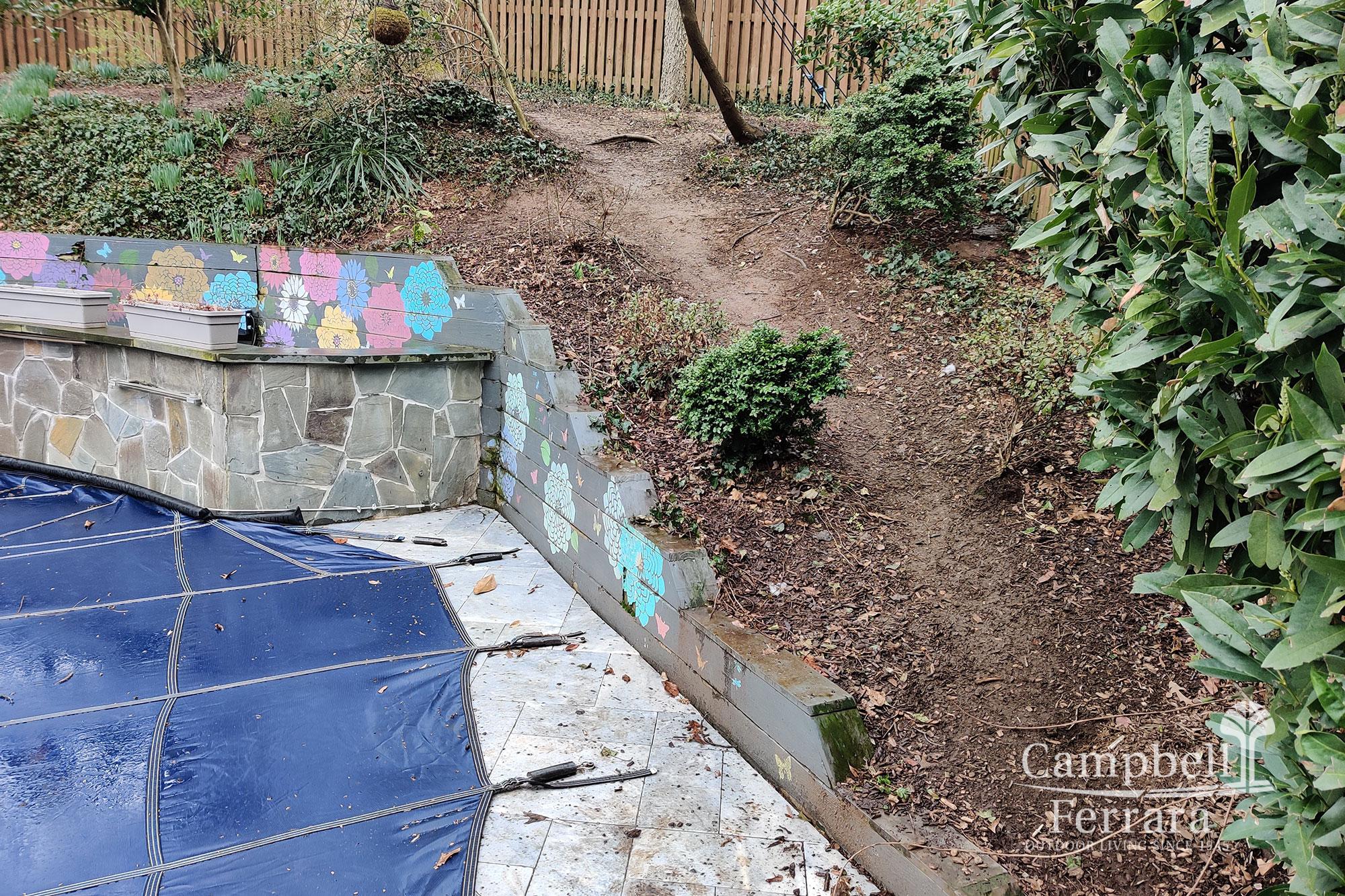 The client wanted solutions that would address the failing timber wall. The erosion on the slope was causing mulch and soil washout. They needed easy and safe access to the upper yard space and a redesign of planted areas of the landscape as they were lackluster and needed greater continuity.