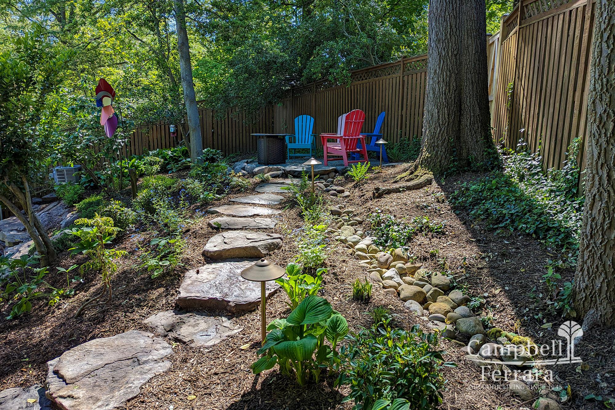 Lighting – Lighting was integrated throughout with path lights along the steps and patio for safety, as well as spotlights to highlight the new and existing plantings, adding ambience, character, and evening use of the space.