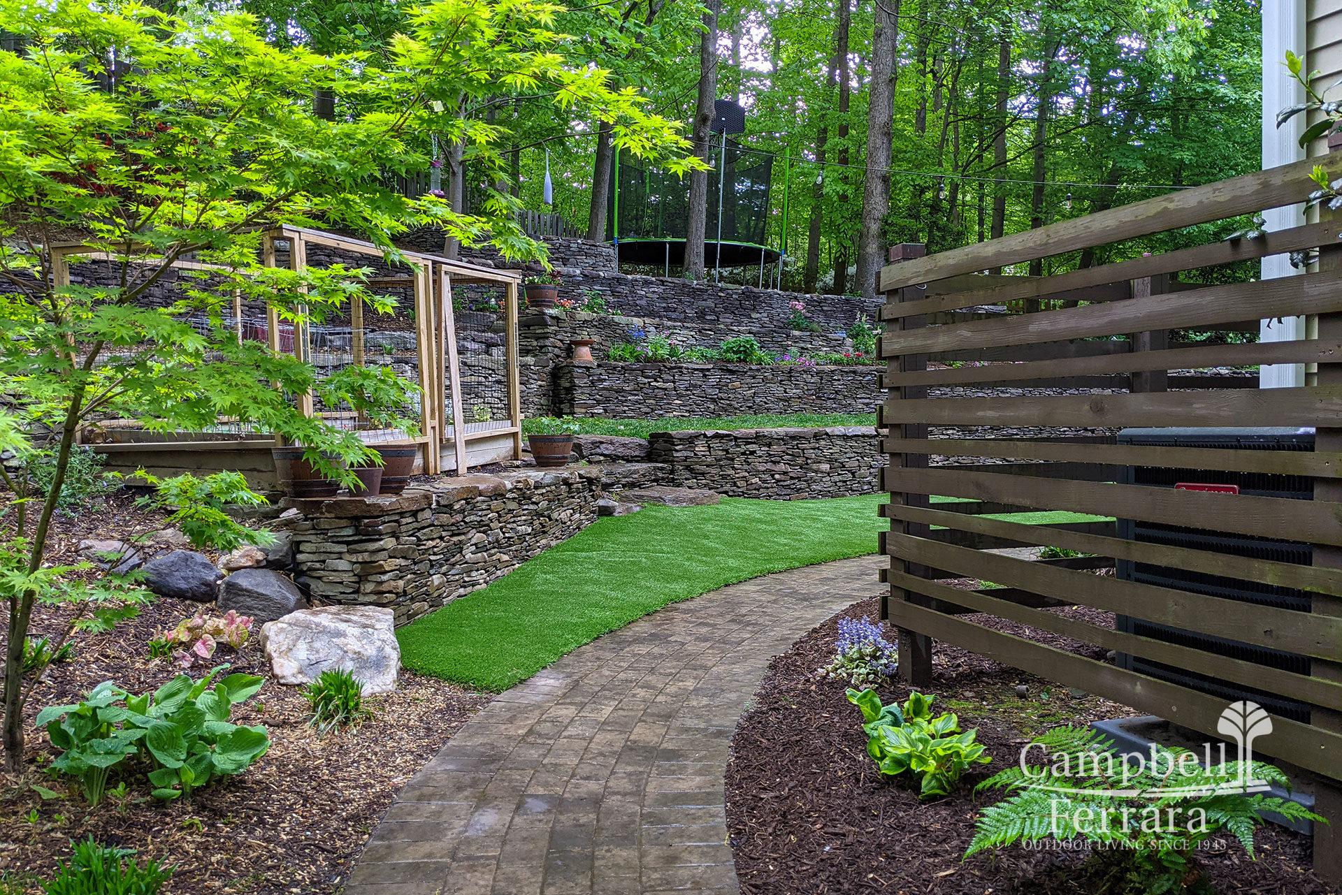 The most challenging aspect of this design was the terrain of the property. It was very hilly with a difficult slope and required extensive grading to create usable spaces. A series of terraced stone walls were installed to create multi-level usable space, separate but unified.
